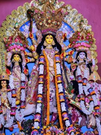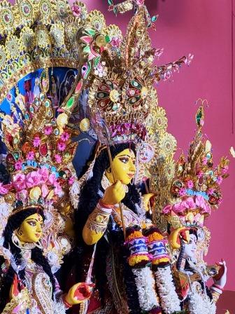 কালি কলম মনন–এর প্রতিবেদন: দেবীর স্বপ্নাদেশে ওপার বাংলায় শুরু হওয়া ঐতিহ্যবাহী ভোজেশ্বর পালচৌধুরি পরিবারের পুজো এবার ৩৫৫ বছরে। সাধারণত দুর্গার ডানদিকে লক্ষ্মীর পাশে থাকে গণেশ আর বাঁদিকে সরস্বতীর পাশে থাকে কার্তিক। কিন্তু এখানে ডানদিকে লক্ষ্মীর পাশে কার্তিক ও বাঁদিকে সরস্বতীর পাশে গণেশ— স্বপ্নে এভাবেই ছেলে–মেয়েদের নিয়ে দেখা দিয়েছিলেন মা দুর্গা। সেই রীতি আজও অক্ষুন্ন। দেবীর আশীর্বাদে ব্যবসার বিপুল মুনাফা দিয়েই শুরু হয় মা দুর্গার আরাধনা। এরপর তাঁদের উন্নতির অশ্বমেধের ঘোড়া ছুটতে থাকে। তাঁরা হন ভোজেশ্বরের জমিদার। পরবর্তীকালে ইংরেজদের কাছ থেকে পান ‘চৌধুরি’ উপাধি।